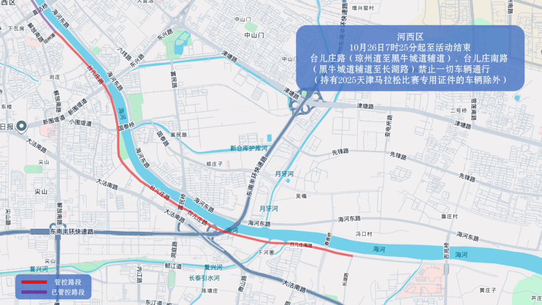 (四)2025年10月26日7时25分起,台儿庄路(琼州道至黑牛城道辅道)、台儿庄南路(黑牛城道辅道至长湖路)禁止一切车辆通行(持有2025310直播马拉松比赛专用证件的车辆除外)。过往社会车辆可绕行解放南路、大沽南路、黑牛城道等道路。