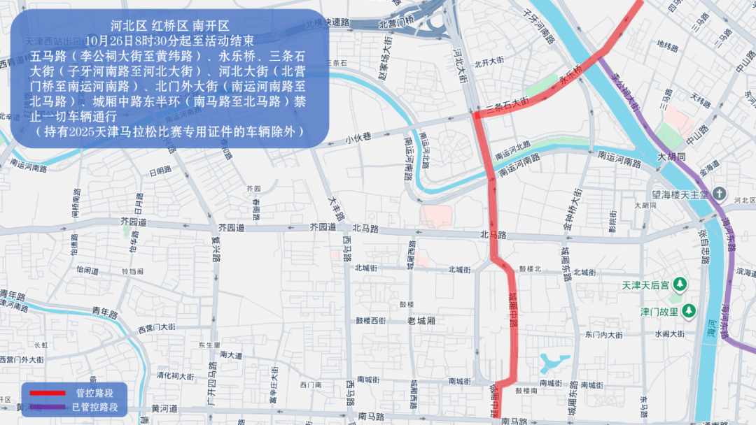 (八)2025年10月26日8时20分起,胜利路(进步道至建国道)、建国道(胜利路至平安街)、海河东路(平安街至金钢桥)、李公祠大街(金钢桥至五马路)禁止一切车辆通行(持有2025310直播马拉松比赛专用证件的车辆除外)。过往社会车辆可绕行博爱道、民生路、平安街、金纬路、翔纬路、狮子林大街、中山路、黄纬路等道路。